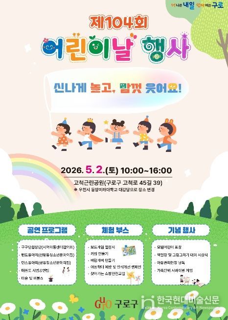한국현대미술신문 배건 기자 | 구로구가 제104회 어린이날을 맞아 오는 5월 2일 고척근린공원에서 어린이와 가족, 지역주민이 함께 즐길 수 있는 ‘어린이날 행사’를 개최한다.