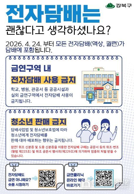 이순희 강북구청장은 “전자담배 역시 금연구역에서 사용할 수 없는 대상이라는 점을 분명히 알리고, 청소년 보호와 간접흡연 예방을 위해 법령 준수가 필요하다”며 “앞으로도 금연 환경 조성과 구민 건강 증진을 위한 정책을 지속적으로 추진하겠다”고 말했다.