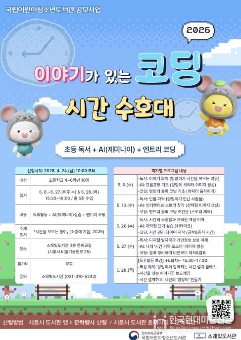 한국현대미술신문 배윤섭 기자 | 시흥시 소래빛도서관은 국립어린이청소년도서관이 주최하는 ‘2026년 이야기가 있는 코딩’ 공모사업 운영기관으로 선정돼 오는 5월 6일부터 어린이 대상 독서·디지털 융합 프로그램을 운영한다.