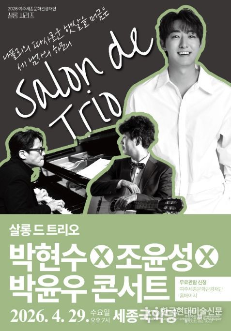 한국현대미술신문 배윤섭 기자 | 여주세종문화관광재단이 오는 29일, 문화가 있는 날을 맞아 2026년 특별기획 살롱 시리즈의 세 번째 무대 '살롱 드 트리오 박현수X조윤성X박윤우 콘서트'를 세종국악당에서 개최한다.