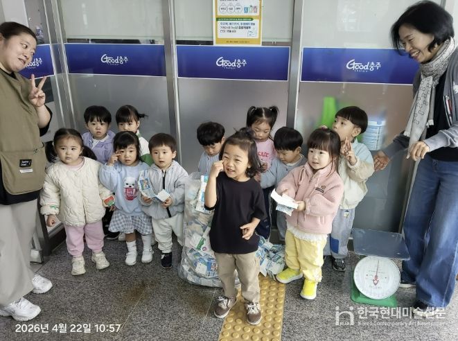 한국현대미술신문 신정은 기자 | 충주시 대소원면 소재 코아키즈어린이집 원생들이 22일 자원 재순환의 가치를 실천하기 위해 대소원면행정복지센터를 방문했다.