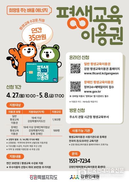 한국현대미술신문 원진 기자 | 홍천군이 경제적 여건에 따른 교육 격차를 줄이고 평생교육 소외계층 성인의 자아실현을 돕기 위해 ‘2026년 강원특별자치도 평생교육이용권 2차 신청’을 4월 27일부터 5월 8일까지 받는다.