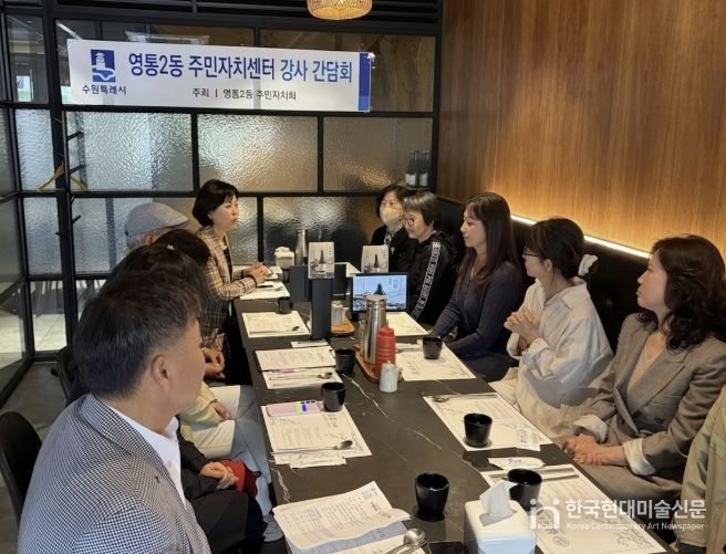 한국현대미술신문 배윤섭 기자 | 수원시 영통구 영통2동은 지난 22일 영통2동 주민자치회가 주민자치센터 프로그램 운영과 관련한 다양한 의견을 수렴하고, 보다 내실 있는 운영과 활성화 방안을 모색하기 위해 주민자치센터 프로그램 강사진과의 간담회를 개최했다고 밝혔다.