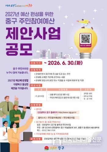한국현대미술신문 박재남 기자 | 인천시 중구는 ‘2027년도 예산편성을 위한 주민참여예산 제안사업 공모’를 추진한다고 23일 밝혔다.