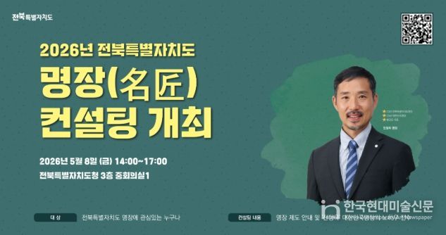 한국현대미술신문 기자 | 전북특별자치도는 5월 8일 전북도청 3층 중회의실에서 ‘2026년 전북특별자치도명장 컨설팅’을 개최한다고 23일 밝혔다.