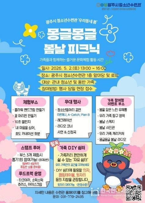 한국현대미술신문 배윤섭 기자 | 광주시 청소년수련관은 오는 5월 2일 오후 1시부터 수련관 1층 앞마당 및 로비에서 ‘2026년 우리동네 봄 몽글몽글 봄날 소풍’을 개최한다고 23일 밝혔다.