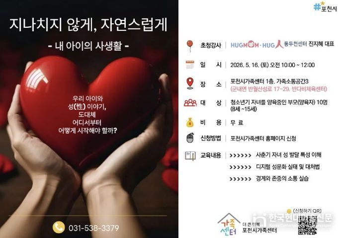 한국현대미술신문 배윤섭 기자 | 포천시 직영 더 큰 행복 포천시가족센터는 오는 21일부터 사춘기 자녀를 둔 양육자를 대상으로 부모 교육 프로그램 ‘지나치지 않게, 자연스럽게’의 참여자를 모집한다. 이번 교육은 5월 16일 오전, 포천시가족센터 가족소통공간(반다비체육센터 1층)에서 대면 강의로 진행된다.