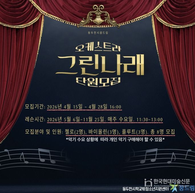 한국현대미술신문 배윤섭 기자 | 동두천시학교밖청소년지원센터는 2026년을 맞아 학교 밖 청소년을 대상으로 ‘그린나래 오케스트라’ 신규 단원을 모집한다고 밝혔다.