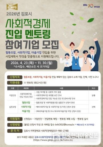 한국현대미술신문 배윤섭 기자 | 김포시는 협동조합, 사회적기업, 마을기업 등 사회적경제기업 진입을 지원하기 위해 ‘2026년 김포시 사회적경제 진입 멘토링’ 참여기업을 오는 11월 30일까지 수시 모집한다.