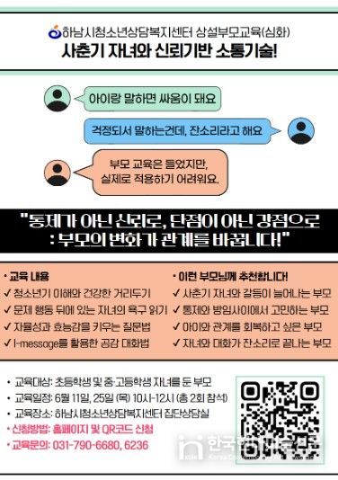 한국현대미술신문 배윤섭 기자 | 하남시 청소년상담 복지센터가 부모와 자녀 간 소통을 돕기 위한 부모교육 프로그램을 한층 강화한다. 특히 청소년기 자녀와의 대화에 어려움을 느끼는 부모들이 실제로 체감할 수 있는 교육으로 개편한 것이 특징이다.