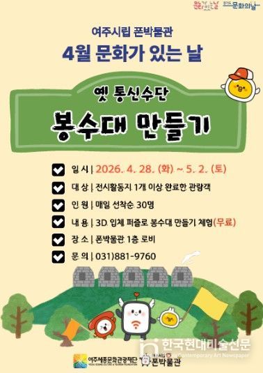 한국현대미술신문 배윤섭 기자 | 여주세종문화관광재단이 운영하는 여주시립 폰박물관은 4월 '문화가 있는 날'을 맞아 오는 4월 28일부터 5월 2일까지 시민 참여형 체험 행사 '소식을 전하던 봉수대 만들기'를 운영한다.