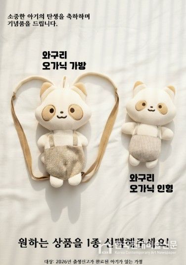 이번에 추가된 축하 기념품은 ‘와구리 백팩’으로, 기존에 지급하던 ‘와구리 애착인형’과 새롭게 추가된 ‘와구리 백팩’ 가운데 하나를 선택해 받을 수 있다. 유기농 애착 인형은 아이의 정서적 안정과 수면 습관 형성에 도움을 주어 정서적 교감을 중시하는 가정에 적합하며, 와구리 백팩은 기저귀와 손수건 등 간단한 유아용품을 수납할 수 있도록 제작돼 실용성을 중시하는 가정에 도움이 될 것으로 기대된다.
