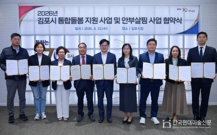 한국현대미술신문 배윤섭 기자 | 김포시가 일상생활 서비스 제공기관 6개소, 관내 종합 병원 2개소, 김포시 우체국과 함께 김포시 통합돌봄사업 및 안부살핌 사업 추진을 위한 업무협약을 22일 체결했다. 이번 업무협약은 '돌봄통합지원법'시행에 발맞춰 돌봄이 필요한 65세 이상 노인을 대상으로 시행하는 것으로, 가사·식사 지원, 목욕 및 이동 등 생활에 필수적인 서비스부터 고립 예방까지 체계적 지원이 이뤄질 것으로 기대된다.