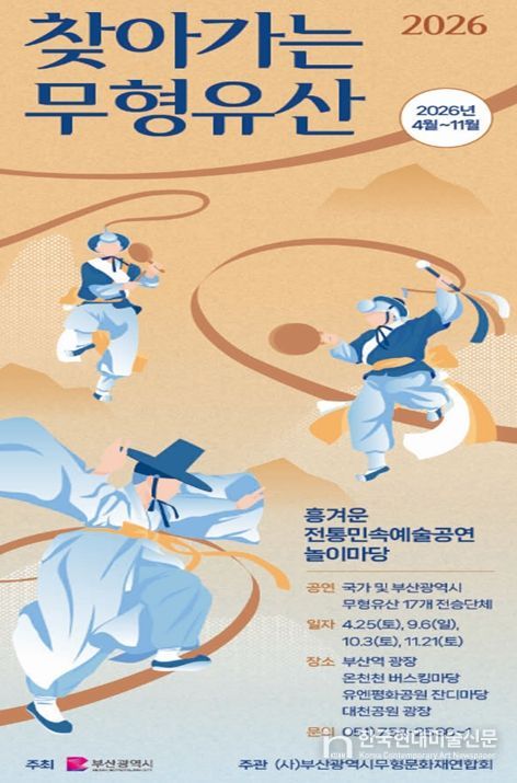한국현대미술신문 정소영 기자 | 부산시는 무형유산 전통 민속예술의 가치를 확산하고, 신명 나고 흥겨운 전통 민속예술 공연으로 시민들의 삶에 활력을 불어넣기 위해 '2026 찾아가는 무형유산' '전통민속예술공연 놀이마당'을 개최한다고 밝혔다.