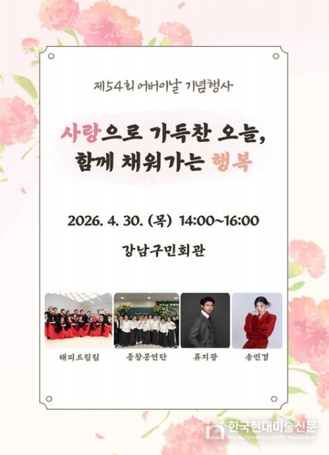 한국현대미술신문 배건 기자 | 꿈이 모이는 도시, 미래를 그리는 강남구가 제54회 어버이날을 맞아 4월 30일 오후 2시부터 4시까지 강남구민회관에서 기념행사를 개최하고, 5월 8일에는 7개 노인복지관에서 다채로운 행사를 이어간다.