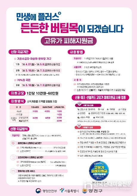 한국현대미술신문 배건 기자 | 양천구가 중동 전쟁에 따른 고유가·고물가로 어려움을 겪는 구민의 경제적 부담을 완화하기 위해 ‘고유가 피해지원금’ 전담 추진단을 구성하고 27일부터 지급 절차를 시작한다고 밝혔다.