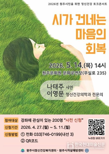 한국현대미술신문 원진 기자 | 원주시정신건강복지센터는 다음 달 14일 원주문화원 문화공연장에서 ‘시가 건네는 마음의 회복’을 주제로 정신건강 토크콘서트를 개최한다.