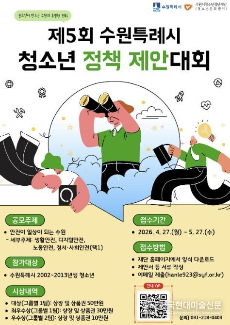 한국현대미술신문 배윤섭 기자 | 수원시청소년청년재단 수원청소년문화센터는 청소년이 정책을 기획하고 제안하는 ‘제5회 수원특례시 청소년 정책 제안대회’ 참가팀을 4월 27일부터 5월 27일까지 모집한다.