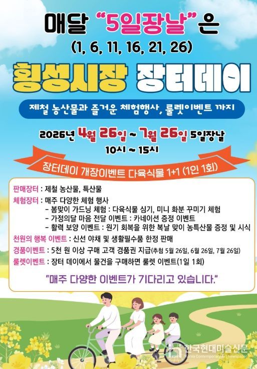 한국현대미술신문 원진 기자 | 횡성군이 전통시장 내 고객 유입을 촉진하고 지역 경제에 활력을 불어넣기 위해 오는 4월 26일부터 7월 26일까지 ‘2026 횡성전통시장 장터데이’ 행사를 개최한다.