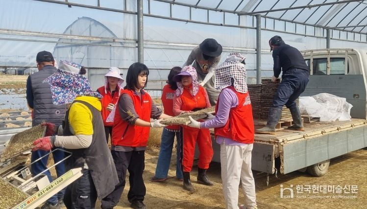 한국현대미술신문 배윤섭 기자 | 파주시 교하 연다산동은 지난 23일, 한국건강관리협회 서울서부지부 임직원 및 어머니봉사단의 '1사1촌 농번기 일손 나눔’의 일환으로 ‘모판 나르기 행사’를 성공적으로 진행했다.