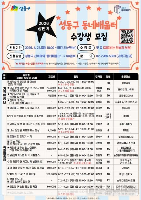 한국현대미술신문 배건 기자 | 서울 성동구가 올해 약 3,800만 원의 예산을 투입해 주민 주도형 평생학습 생태계를 조성하는 ‘2026년 성동구 동네배움터’ 운영에 본격적으로 나선다고 밝혔다.
