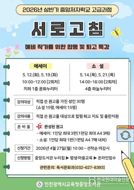 한국현대미술신문 박재남 기자 | 인천광역시교육청중앙도서관은 4월 27일부터 예비 작가를 위한 ‘중앙저자학교 고급과정’ 참여자를 모집한다.