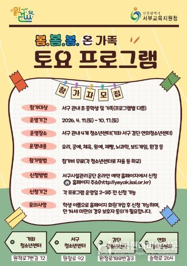 한국현대미술신문 박재남 기자 | 인천서부교육지원청은 4월 11일부터 10월 17일까지 ‘2026 서부 방과후·돌봄 지역연계(봄봄봄) 온 가족 토요 프로그램’을 운영한다.