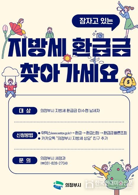한국현대미술신문 배윤섭 기자 | 의정부시는 납세자가 아직 찾아가지 않은 지방세 환급금을 돌려주기 위해 5월 말까지 ‘지방세 환급금 일제정리 기간’을 운영한다.