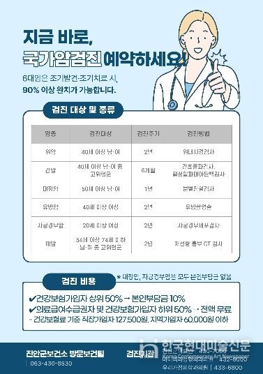 국가암검진사업은 암 치료율을 높이고 사망률을 낮추기 위해 시행되고 있으며, 위암·대장암·간암·유방암·자궁경부암·폐암 등 6대 암을 대상으로 한다. 의료급여 수급권자와 건강보험료 하위 50% 대상자는 무료로 검진을 받을 수 있으며, 그 외 대상자는 검진비의 10%만 부담하면 된다.