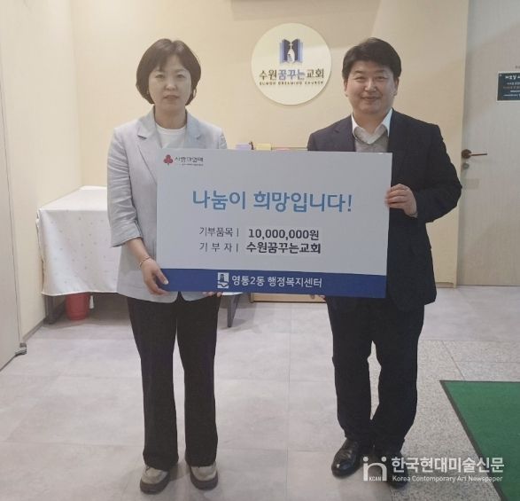 한국현대미술신문 배윤섭 기자 | 수원시 영통구 영통2동은 지난 23일 수원꿈꾸는교회가 지역사회 내 취약계층 지원을 위해 교인들과 함께 모금한 사랑의 성금 1천만원을 영통2동 행정복지센터에 기부했다고 밝혔다.