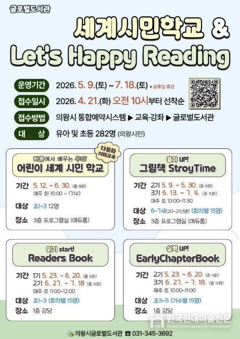 한국현대미술신문 배윤섭 기자 | 의왕시 글로벌도서관이 책을 통해 세상을 이해하고 체험하는 다문화 이해 프로그램 '어린이 세계 시민 학교'와 영어 읽기 문해력 향상을 위한 단계별 맞춤 프로그램 'Let’s Happy Reading'의 참여자를 모집한다.