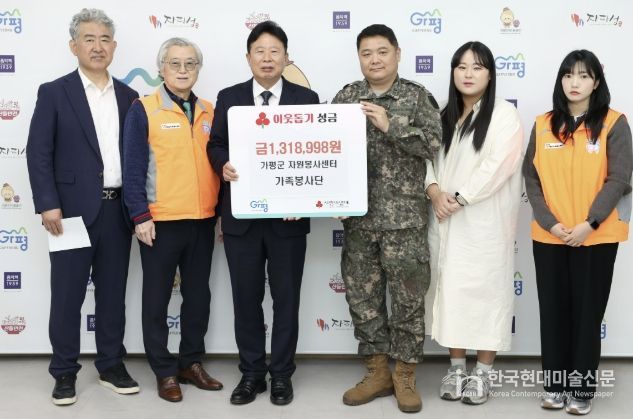 한국현대미술신문 배윤섭 기자 | 가평군 자원봉사센터 가족봉사단은 23일 가평군청 군수실에서 이웃돕기 성금 기탁 전달식을 가졌다. 이날 행사에는 서태원 가평군수를 비롯해 연기복 가족봉사단 회장, 이명열 가평군 자원봉사센터장 등이 참석했다.