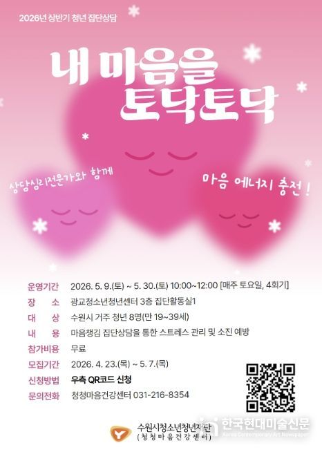 한국현대미술신문 배윤섭 기자 | 수원시청소년청년재단 청청마음건강센터는 학업과 취업준비, 직장생활 등 경쟁 중심 환경으로 인해 심리적 소진을 겪는 관내 청년들을 대상으로, 오는 5월 7일까지 전문가가 참여하는 집단상담 프로그램 ‘내 마음을 토닥토닥’ 참가자를 모집한다고 밝혔다.