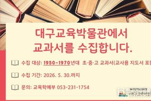 홍진근 관장은 “교과서는 당시 교육의 모습과 시대의 변화를 엿볼 수 있는 소중한 자료”라며, “많은 분들께서 함께 참여해 대구교육의 발자취를 담아주시면 감사하겠다”고 전했다.