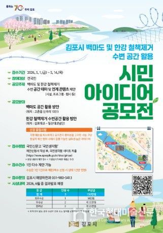 한국현대미술신문 배윤섭 기자 | 김포시가 한강 철책 제거 부지와 백마도 등 천혜의 수변 자원을 시민들의 쉼터와 문화 공간으로 탈바꿈하기 위해 ‘시민 아이디어 공모전’을 개최한다고 밝혔다. 이번 공모전은 ‘김포시 백마도 및 한강 철책 제거 수변 공간 활용’을 주제로, 시민들의 창의적이고 실효성 있는 아이디어를 발굴해 시정 운영에 적극 반영하기 위해 마련됐다.