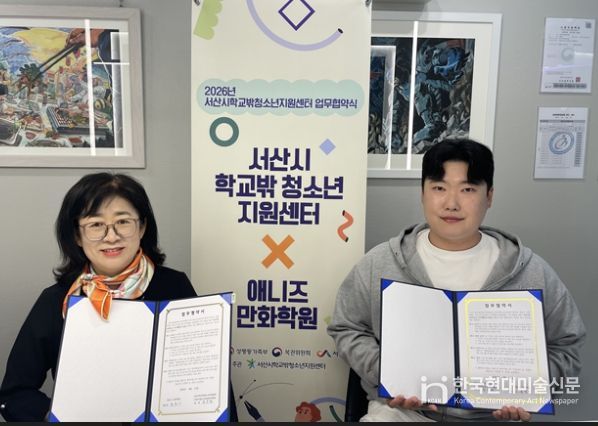 한국현대미술신문 신정은 기자 | 충청남도 서산시학교밖청소년지원센터는 4월 23일, 애니즈 만화학원과 학교 밖 청소년의 자기계발 및 진로 탐색 지원을 위한 업무 협약(MOU)을 체결했다.