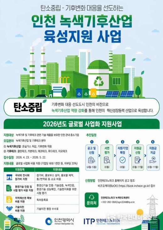 한국현대미술신문 정소영 기자 | 인천테크노파크(인천TP)는 중소기업의 녹색기후·기후테크 분야 글로벌 진출을 지원하고자 ‘2026년 녹색기후산업 글로벌 사업화 지원사업’의 참여기업을 5월 22일까지 모집한다.