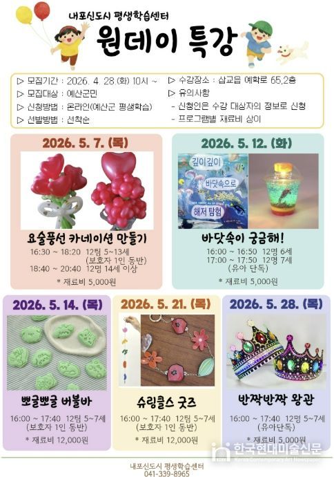 한국현대미술신문 신정은 기자 | 예산군 내포신도시 평생학습센터는 5월을 맞아 지역 어린이를 위한 체험형 원데이 특강 프로그램을 운영한다.