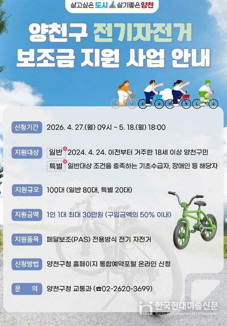 한국현대미술신문 배건 기자 | 양천구는 탄소중립 실천과 구민의 이동 편의 증진을 위해 서울시 자치구 가운데 유일하게 시행 중인 ‘전기자전거 구입 보조금 지원사업’을 올해도 지속 추진한다고 27일 밝혔다.