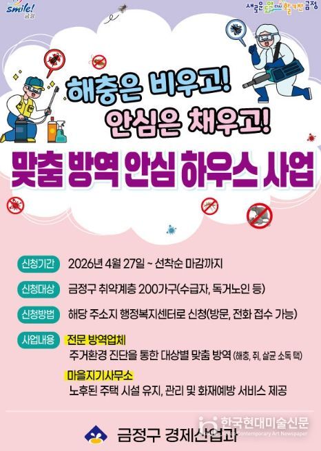 한국현대미술신문 정소영 기자 | 부산 금정구는 관내 취약계층의 쾌적하고 안전한 주거 환경 조성을 위해 ‘맞춤 방역 안심하우스’ 사업을 추진하고, 오는 4월 27일부터 대상 가구를 모집한다고 밝혔다.