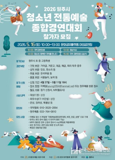 한국현대미술신문 원진 기자 | 사단법인 한국예술문화단체총연합회 원주지회는 오는 5월 개최되는 ‘제30회 원주 청소년 예술제’를 앞두고, 무대의 주인공이 될 지역 청소년 참가자를 모집한다.
