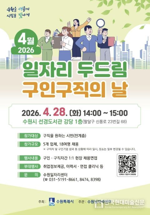한국현대미술신문 배윤섭 기자 | 수원특례시는 4월 28일 오후 2시부터 3시까지 선경도서관 강당에서 ‘4월 일자리 두드림 구인·구직의 날’을 개최한다.