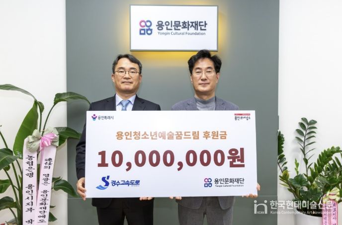 한국현대미술신문 배윤섭 기자 | 용인문화재단은 지난 23일 경수고속도로(주)로부터 용인시 관내 청소년 예술 장학사업인 ‘용인청소년예술꿈드림’ 지원을 위한 기부금 1,000만 원을 기탁받았다고 밝혔다. 이번 후원은 용인서울고속도로를 이용하는 통행차량 1대당 1원씩 적립하고, 사회공헌예산을 추가로 편성해 지역사회 환원과 기업의 사회적 책임 실천 차원에서 추진됐다.