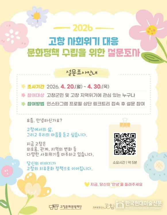 한국현대미술신문 기자 | 고창문화도시센터는 고창군이 직면한 사회위기 현황과 군민 인식을 파악하기 위해 ‘2026 고창 사회위기 대응 문화정책 수립을 위한 설문조사’를 추진한다.