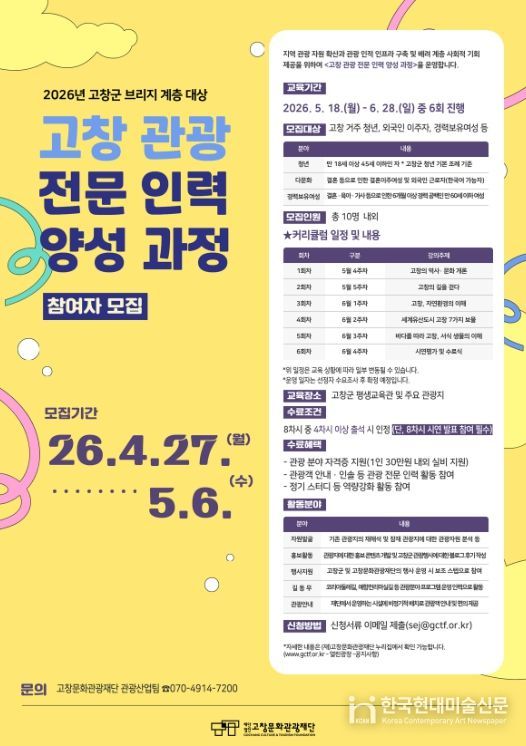 한국현대미술신문 기자 | 고창문화관광재단은 27일부터 지역 관광 활성화 및 수용태세 개선을 위해 ‘2026년 관광 전문인력 양성사업’ 참여자를 모집한다고 밝혔다.