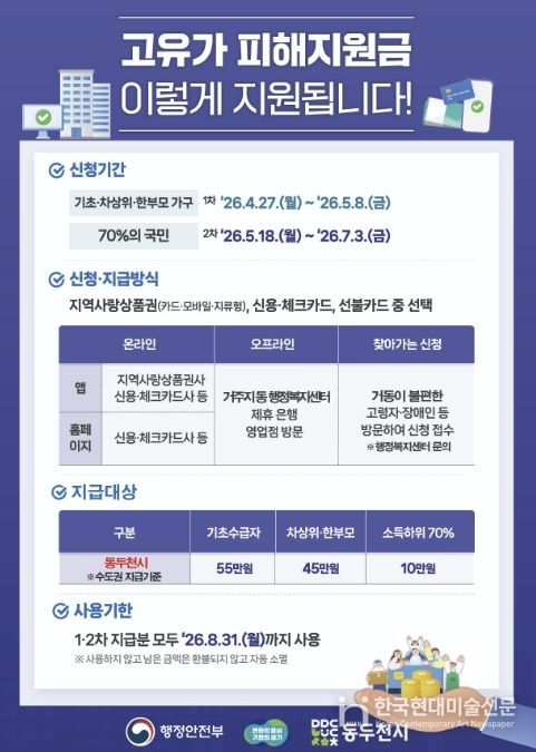 한국현대미술신문 배윤섭 기자 | 동두천시가 중동발 고유가와 고물가로 인한 시민 부담을 완화하고 지역경제 회복을 지원하기 위해 ‘고유가 피해지원금’을 지급한다.