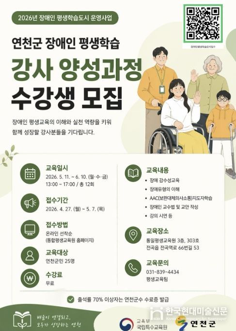 한국현대미술신문 배윤섭 기자 | 연천군은 교육부 국립특수교육원이 주관하는 '2026년 장애인 평생학습도시 운영 지원사업' 공모에 선정됨에 따라 장애인 평생교육 현장형 강사 양성 과정을 운영한다.