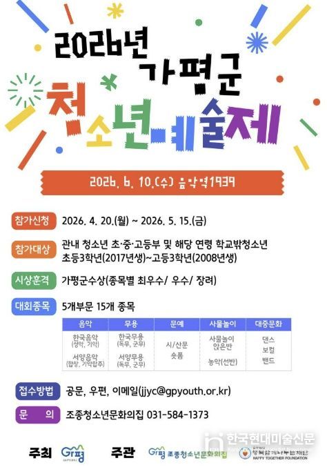 한국현대미술신문 배윤섭 기자 | 가평군이 오는 6월 10일 열리는 ‘2026년 가평군청소년예술제’를 앞두고 예술적 끼와 재능을 겨룰 청소년들을 5월 15일까지 모집한다.