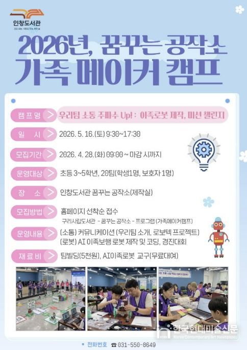 한국현대미술신문 배윤섭 기자 | 구리시 인창도서관‘꿈꾸는 공작소’는 오는 5월 16일 초등학생 자녀와 보호자가 함께 참여해 가족 간 유대감을 높이고 인공지능을 체험하는 '우리 팀 소통 주파수 Up! : 이족로봇 제작, 미션 챌린지' 가족 메이커 캠프를 운영한다고 밝혔다.