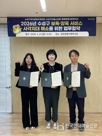 한국현대미술신문 정소영 기자 | 대구 수성구육아종합지원센터(센터장 심영숙)는 지난 24일 수성구 드림스타트센터(센터장 김은미), 함장종합사회복지관(관장 권혁철)과 지역 내 보육·양육 서비스 사각지대 해소를 위한 ‘3자 업무협약(MOU)’을 체결했다고 밝혔다.